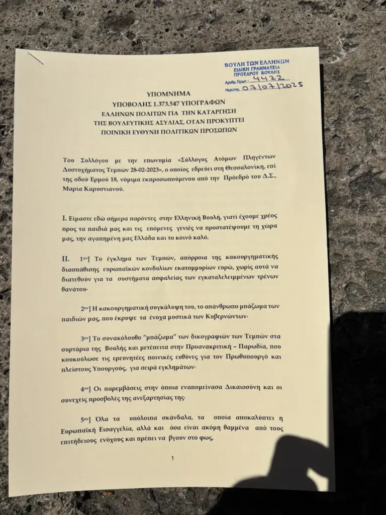 Το πρωί κατατέθηκαν στη Βουλή 1,3 εκατομμύρια υπογραφές από τον Σύλλογο Πληγέντων Δυστυχήματος Τεμπών, με αίτημα την αναθεώρηση του Συντάγματος και την κατάργηση της ασυλίας για τις ποινικές ευθύνες των βουλευτών.