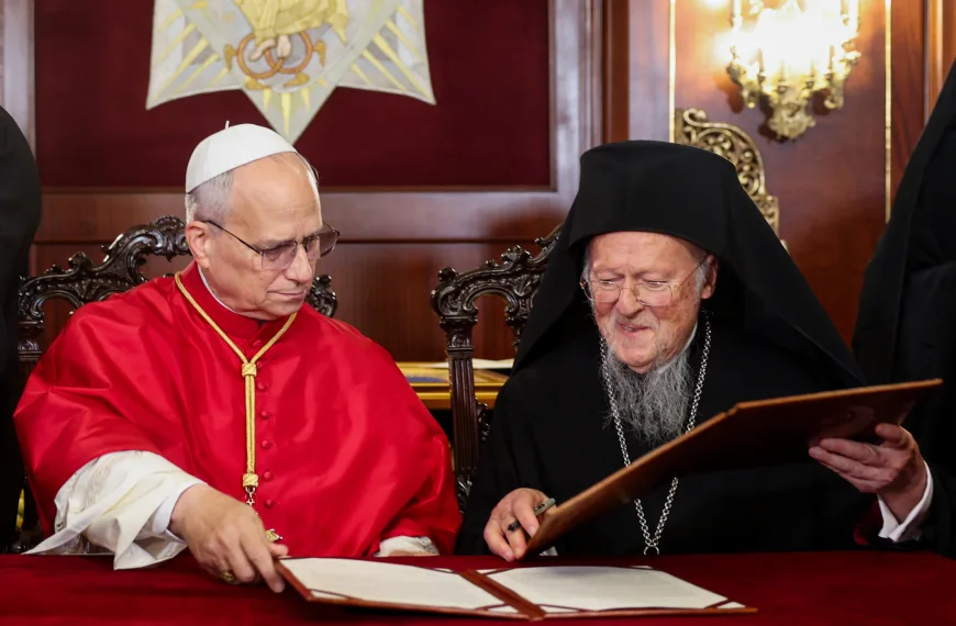 Σε ιδιαίτερα θερμό κλίμα έφθασε στις 14:20 (ώρα Ελλάδος) στο Οικουμενικό Πατριαρχείο στο Φανάρι ο Πάπας Λέων ΙΔ’, συνοδευόμενος από την παπική ακολουθία του, όπου τον υποδέχθηκε με τιμές ο Οικουμενικός Πατριάρχης Βαρθολομαίος. Οι δύο προκαθήμενοι κατευθύνθηκαν μαζί στον πατριαρχικό ναό του Αγίου Γεωργίου, όπου τελέστηκε δοξολογία, παρουσία του Πατριάρχη Αλεξανδρείας Θεοδώρου, ιεραρχών των Εκκλησιών … Συνεχίστε να διαβάζετε το Φανάρι/Ιστορικές στιγμές: Υπεγράφη κοινή δήλωση Πάπα-Οικουμενικού Πατριάρχη μετά την δοξολογία στον Άγιο Γεώργιο.