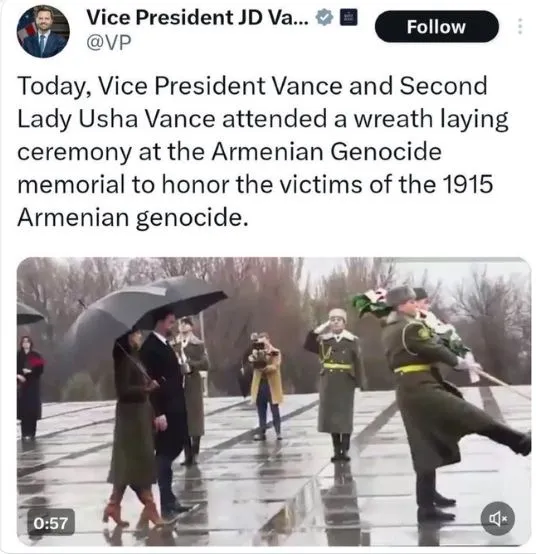 ✨Κατά την επίσκεψή του στην Αρμενία, ο Βανς τίμησε τα θύματα της γενοκτονίας στο μνημείο Τσιτσερνακαμπέρντ μαζί με τη σύζυγό του σε τελετή μνήμης.