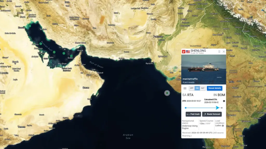 Δεξαμενόπλοιο ελληνικών συμφερόντων, του suezmax Shenlong χωρητικότητας 159.000 dwt, το οποίο μετέφερε περίπου ένα εκατομμύριο βαρέλια πετρελαίου από τον Περσικό Κόλπο εντοπίστηκε ανοιχτά της Ινδίας, μετά από διέλευση από τα στενά του Ορμούζ.