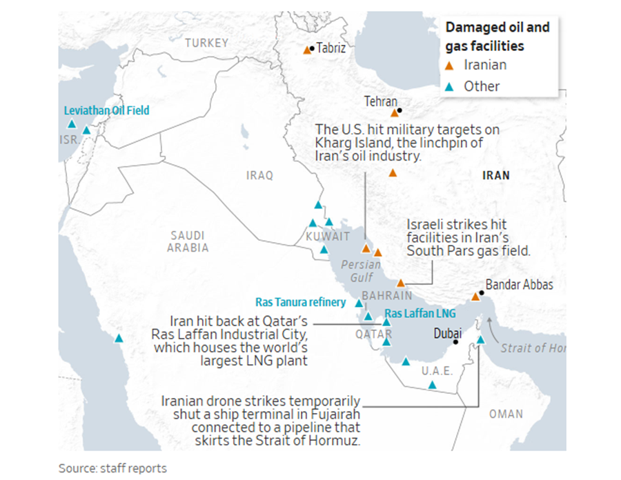 Η Wall Street Journal δημοσίευσε χάρτη με τις ενεργειακές εγκαταστάσεις που έχουν δεχθεί επιθέσεις από την έναρξη του πολέμου.