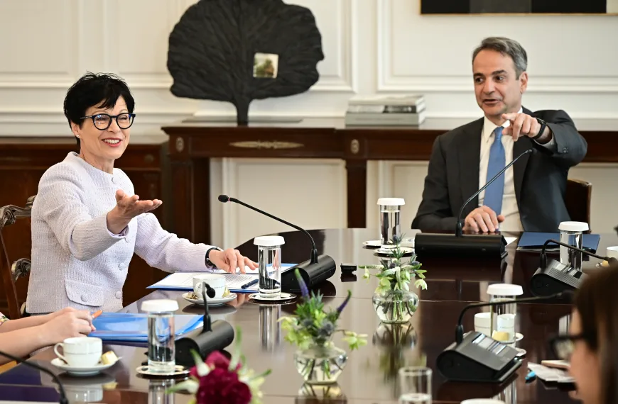 Ο πρωθυπουργός Κυριάκος Μητσοτάκης συναντήθηκε το μεσημέρι στο Μέγαρο Μαξίμου με την Ευρωπαία επίτροπο Διεύρυνσης Marta Kos.