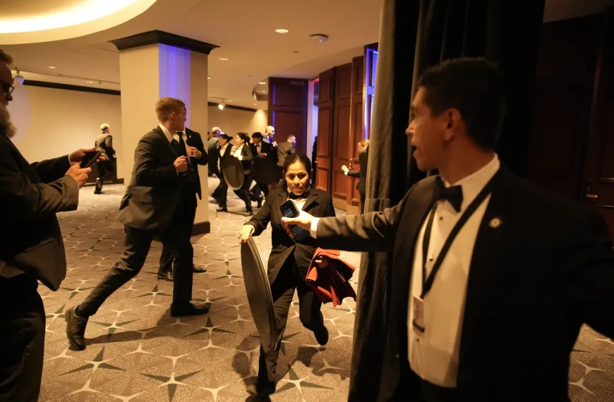 Ο πρόεδρος των ΗΠΑ Ντόναλντ Τραμπ απομακρύνεται άμεσα από το δείπνο των ανταποκριτών του Λευκού Οίκου, το Σάββατο το βράδυ, μετά από πυροβολισμούς. Πλάνα δείχνουν πράκτορες της Μυστικής Υπηρεσίας να συνοδεύουν τον Αμερικανό πρόεδρο εκτός του χώρου, λίγο μετά το περιστατικό.