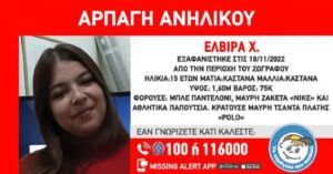 Μία 15χρονη απήχθη από ενήλικο άνδρα, στην περιοχή του Ζωγράφου της Αττικής, το πρωί της 18ης Νοεμβρίου 2022. Συναγερμός σήμανε την Κυριακή όταν το «Το Χαμόγελο του Παιδιού» ενημερώθηκε για την αρπαγή μίας 15χρονης από ενήλικο άνδρα, στην περιοχή του Ζωγράφου της Αττικής. Το κορίτσι απήχθη το πρωί της 18ης Νοεμβρίου 2022 ενώ το «Χαμόγελο […]Περισσότερα ...