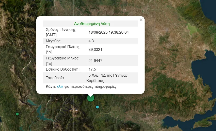 Σεισμός σημειώθηκε στην Κεφαλονιά το βράδυ της Τετάρτης και το επίκεντρο ήταν σε θαλάσσιο χώρο, κοντά στην Άσσο. Σύμφωνα με την αυτόματη λύση του Γεωδυναμικού Ινστιτούτου, στις 22:16 καταγράφηκε δόνηση μεγέθους 3,2 Ρίχτερ ανοιχτά της Κεφαλονιάς. Το επίκεντρο εντοπίστηκε σε θαλάσσιο χώρο 5 χιλιόμετρα δυτικά- νοτιοδυτικά της Άσσου και το εστιακό βάθος ήταν 5 χιλιόμετρα.Περισσότερα ...