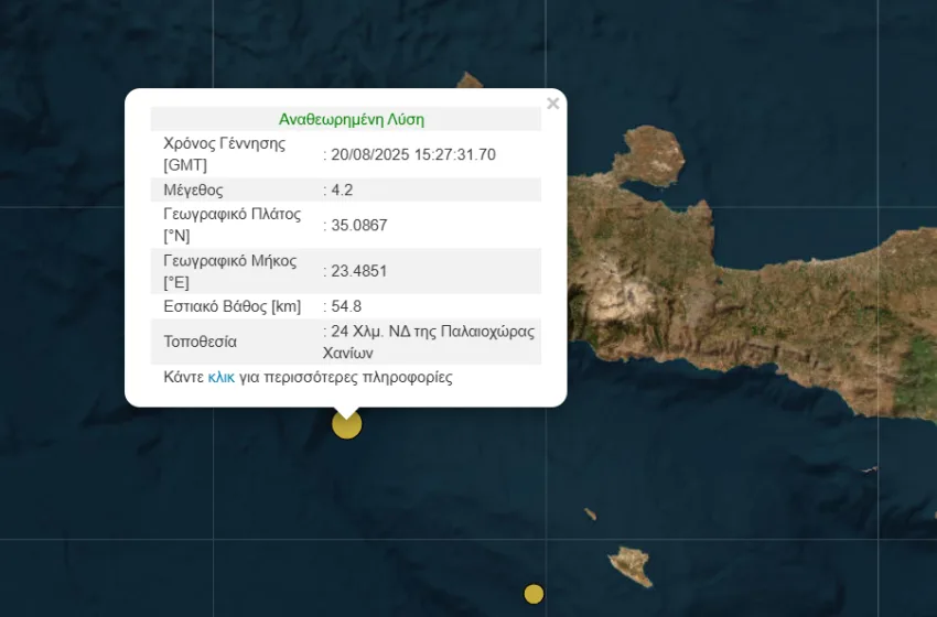 Σεισμός 4,1 βαθμών της κλίμακας Ρίχτερ σημειώθηκε στις 06:55, σε απόσταση 290 χλμ. νότια της Αθήνας. Σύμφωνα με το Γεωδυναμικό Ινστιτούτο του Εθνικού Αστεροσκοπείου Αθηνών, το επίκεντρο της δόνησης εντοπίζεται στον θαλάσσιο χώρο 45 χλμ. δυτικά – νοτιοδυτικά από τα Φαλάσαρνα.Περισσότερα ...