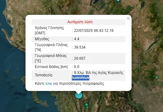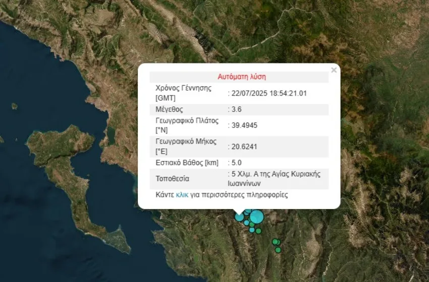 Σεισμός σημειώθηκε στην Κεφαλονιά το βράδυ της Τετάρτης και το επίκεντρο ήταν σε θαλάσσιο χώρο, κοντά στην Άσσο. Σύμφωνα με την αυτόματη λύση του Γεωδυναμικού Ινστιτούτου, στις 22:16 καταγράφηκε δόνηση μεγέθους 3,2 Ρίχτερ ανοιχτά της Κεφαλονιάς. Το επίκεντρο εντοπίστηκε σε θαλάσσιο χώρο 5 χιλιόμετρα δυτικά- νοτιοδυτικά της Άσσου και το εστιακό βάθος ήταν 5 χιλιόμετρα.Περισσότερα ...